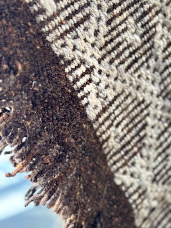 Color Marrón Oscuro con Guarda tramada muy trabajada de 30 cm en color Gris en ambos lados. Flecos marrón oscuro finos