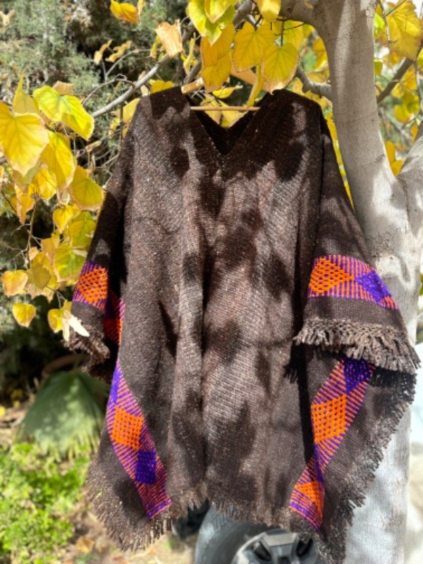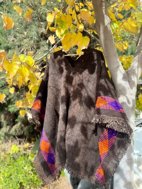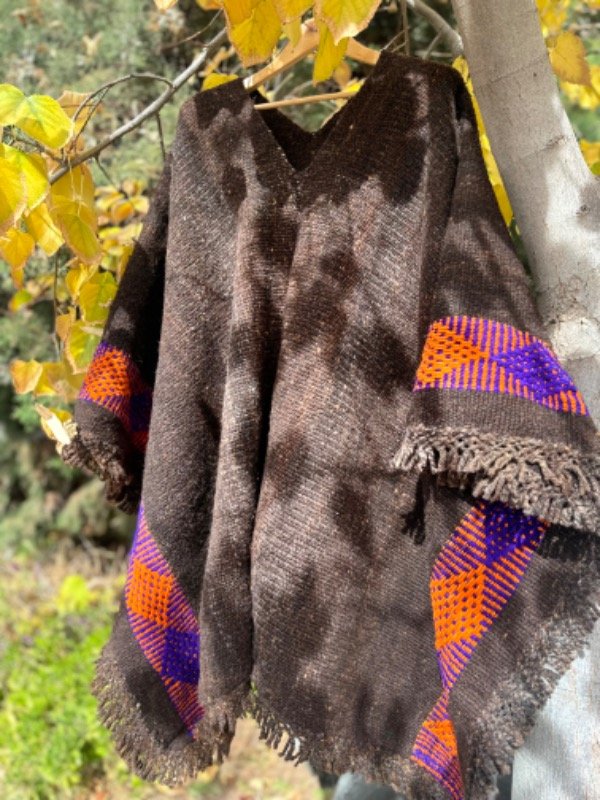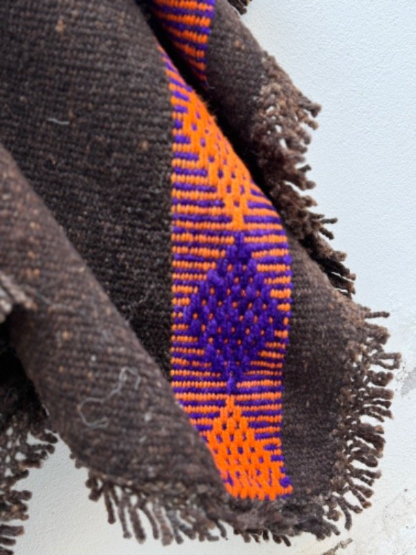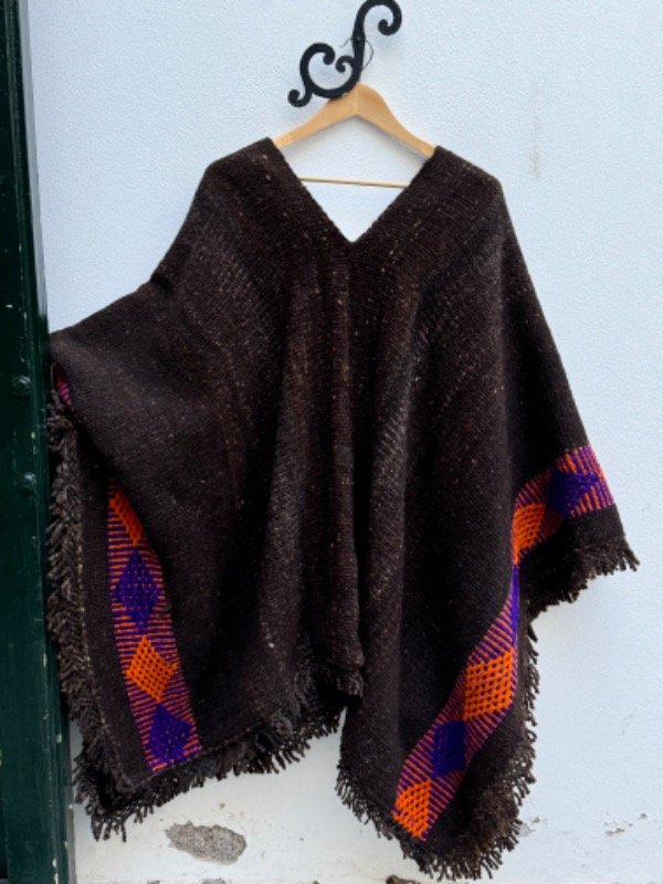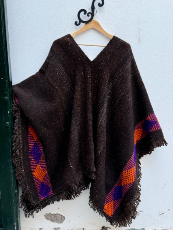 Poncho Rustico Tejido en Telar Artesanal de Pedal, 100%Lana de Oveja , Hilado Semigrueso a Mano. Marrón Oscuro con Guarda Violeta /Naranja en Ambos Lados.